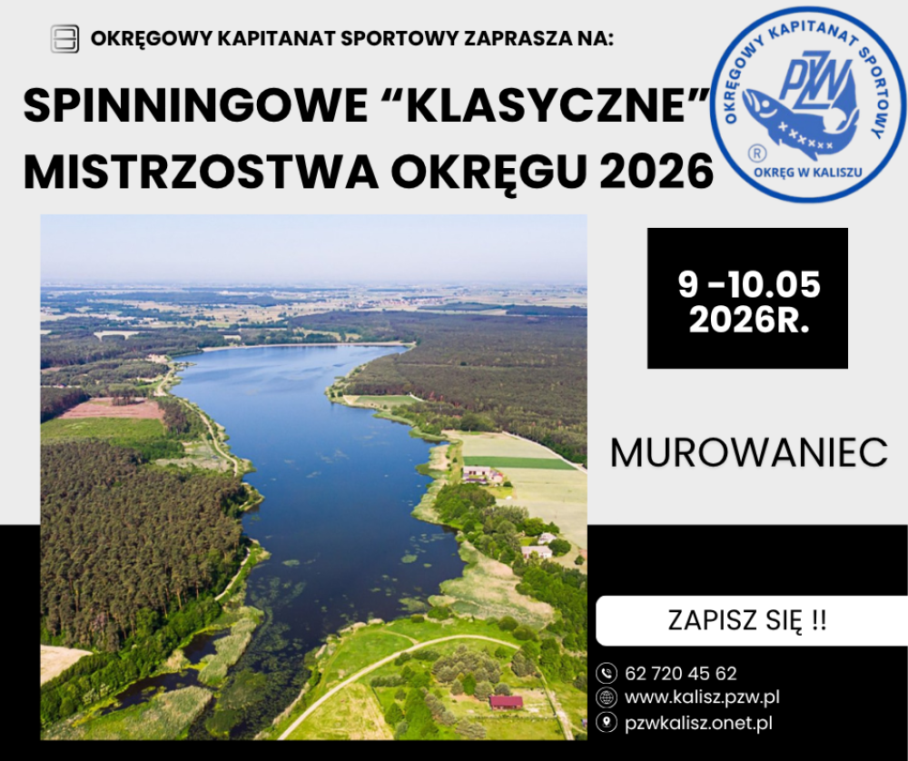 Okręgowy Kapitanat Sportowy Polski Związek Wędkarski Okręg w Kaliszu wraz z Kołem WSK Kalisz ma zaszczyt zaprosić wszystkich chętnych do udziału w rywalizacji o tytuł Mistrza Okręgu w dyscyplinie spinningowej !