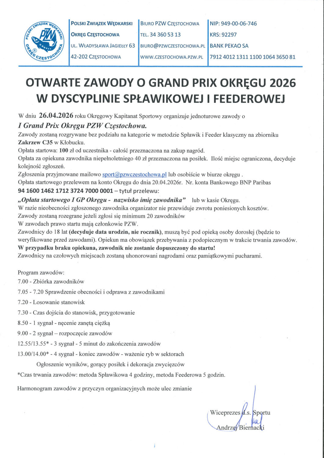 XXXIII Zawody Spławikowe o Puchar Prezesa Okręgu - 12 kwietnia 2026 r.