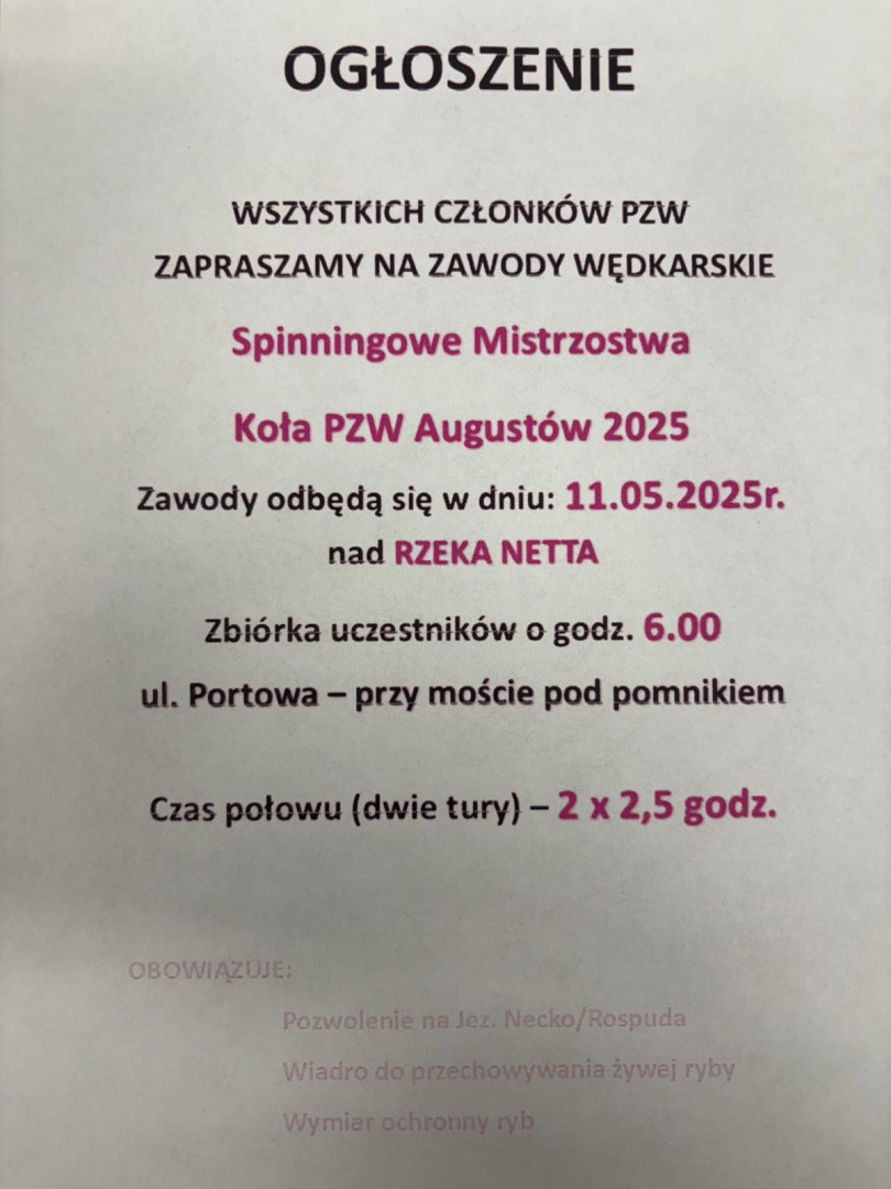 Ogłoszenie na zawody " Spławikowe Mistrzostwa Koła"